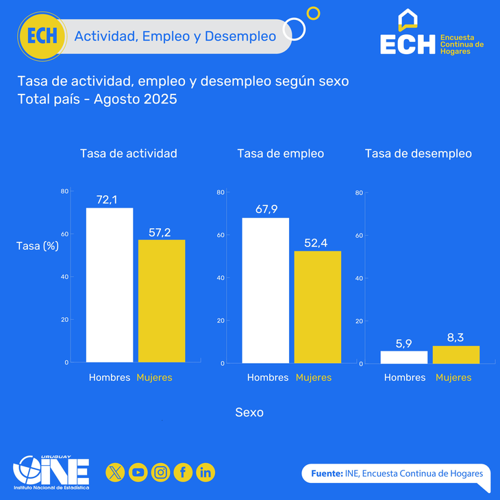 El último informe publicado por el Instituto Nacional de Estadística (INE) estima que la tasa de desempleo durante el mes de agosto se ubicó en 7,0% para el total país, mientras que la tasa de empleo se mantuvo en 59,8% y la de actividad en 64,4%, confirmando que el marcado laboral en el Uruguay se mantiene firme y estable.