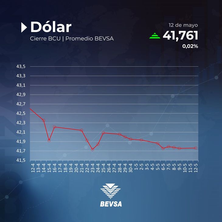 La cotización de cierre en la Bolsa Electrónica de Valores del Uruguay (Bevsa) fue de 41,730 pesos, mientras que el precio máximo fue de 41,790 pesos, y el mínimo de 41,720 pesos. Se realizaron un total de 140 transacciones, con un monto de operaciones por más de 83,5 millones de dólares.