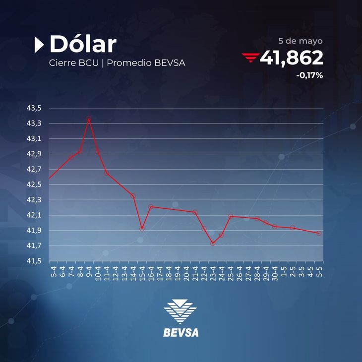 La cotización de cierre en la Bolsa Electrónica de Valores del Uruguay (Bevsa) fue de 41,830 pesos, mientras que el precio máximo fue de 41,900 pesos, y el mínimo de 41,830 pesos. Se realizaron un total de 33 transacciones, con un monto de operaciones por más de 16,5 millones de dólares.