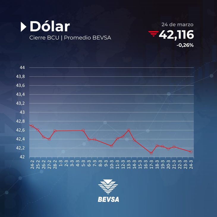 La cotización de cierre en la Bolsa Electrónica de Valores del Uruguay (Bevsa) fue de 42,100 pesos, mientras que el precio máximo fue de 42,150 pesos, y el mínimo de 42,100 pesos. Se realizaron un total de 34 transacciones, con un monto de operaciones por más de 18,3 millones de dólares.
