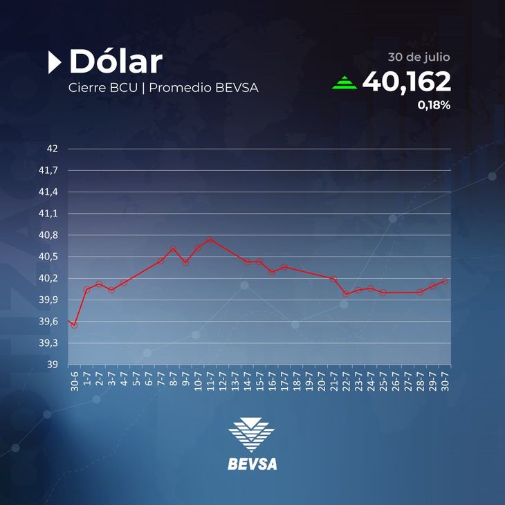 La cotización de cierre en la Bolsa Electrónica de Valores del Uruguay (Bevsa) fue de 40,140 pesos, mientras que el precio máximo fue de 40,180 pesos, y el mínimo de 40,140 pesos. Se realizaron un total de 29 transacciones con un monto de operaciones total de 16.529.846,10 de dólares.