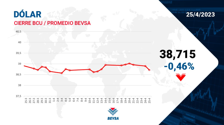 La última operación de la jornada en la Bolsa Electrónica de Valores del Uruguay (Bevsa), fue pactada en 38,99 pesos, mientras que el precio promedio de operaciones fue de 38,955 pesos. Hoy, el número de transacciones fue de un total de 36, con un monto de operaciones de poco más de 30,6 millones de dólares.