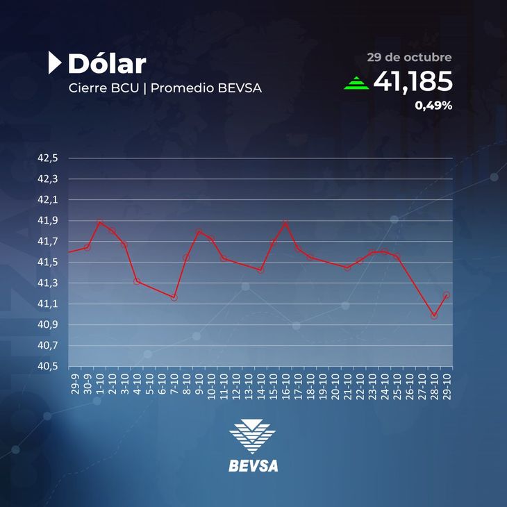 El dólar subió un 0,49% con respecto al lunes y cerró en 41,185 pesos en la cotización interbancaria del Banco Central del Uruguay (BCU), cortando así con dos jornadas consecutivas a la baja tras la pronunciada caída poselectoral, y retornando a la franja de los 41 pesos.