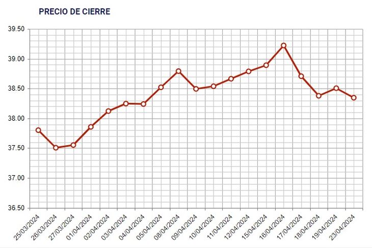 La cotización de cierre en la Bolsa Electrónica de Valores del Uruguay (Bevsa) fue de 38,310 pesos, mientras que el precio máximo también fue de 38,500 pesos, y el mínimo de 38,270 pesos. En este día, el número de transacciones fueron un total de 72, con un monto de operaciones de más de 35,8 millones de dólares.