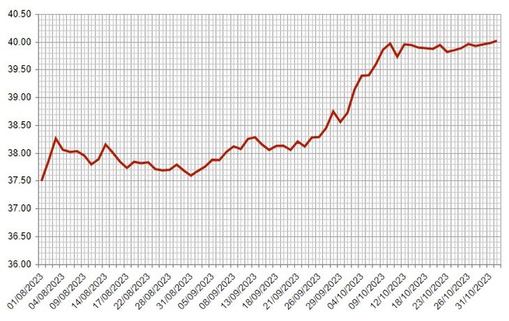 A partir de allí, la divisa tuvo un rally alcista, con una mejora de 2,56% en setiembre, alcanzando los 38,556 pesos. Desde allí, siguió creciendo, retornó a la franja de los 39 pesos y cerró octubre con un aumento de 3,68%, en 39,974 pesos. La estocada final para retornar a lo que fue su "techo" del año la dio durante la jornada del miércoles, cuando se incrementó un 0,11% para alcanzar los 40,019 pesos.