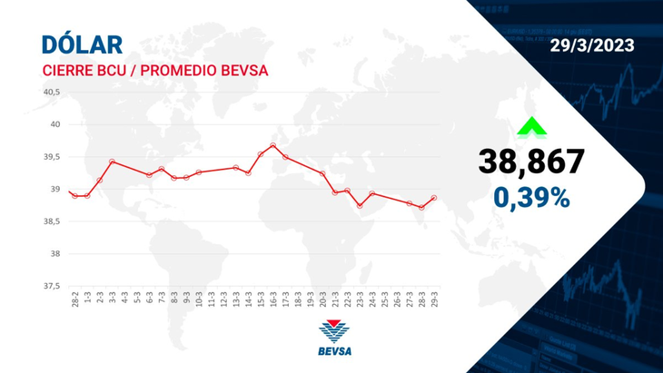 El dólar repuntó un 0,39% respecto a ayer, y quedó en los 38,867 pesos, según la cotización oficial del interbancario del Banco Central del Uruguay (BCU). Tras tocar su su valor más alto en los últimos dos meses hace 13 días, el tipo de cambio se desplomó por debajo del piso de los 39 pesos y nunca regresó. A dos días del cierre de marzo, ¿logrará retornar?
