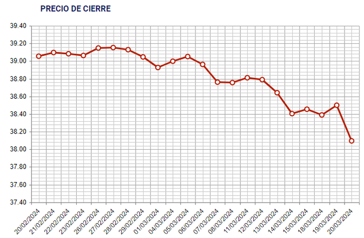 El precio de cierre de la jornada en la Bolsa Electrónica de Valores del Uruguay (Bevsa) fue de 38 pesos, mientras que el precio máximo fue de 38,300 pesos, y el mínimo de 38 pesos. En este día, el número de transacciones fueron un total de 52, con un monto de operaciones de 25,9 millones de dólares.