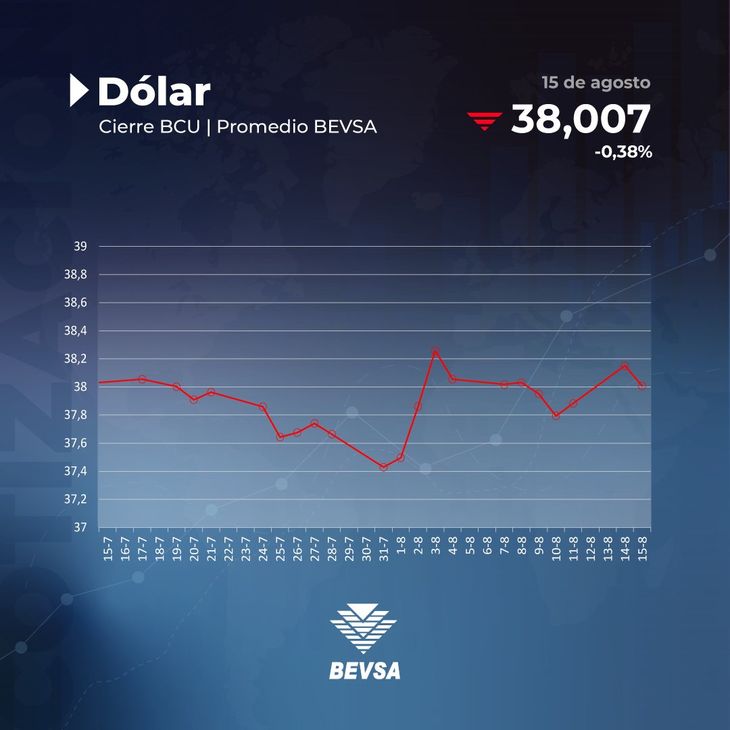 El dólar bajó un 0,38% respecto a la última jornada y cerró hoy en 38,007 pesos, según la cotización oficial del Banco Central del Uruguay (BCU), por lo que la divisa estadounidense quebró con una serie de dos jornadas al alza, aunque acumula un aumento del 1,54% en lo que va del mes de agosto.