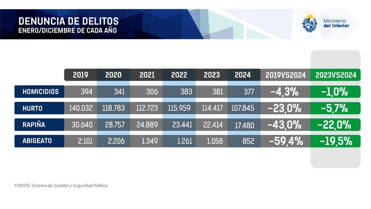 El Ministerio del Interior brindó las cifras de seguridad y se constató un retroceso del 1% con respecto a 2023.