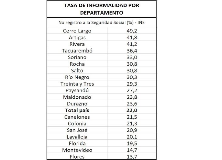 Esto último es clave en una región que tiene los mayores niveles de informalidad del país (cuadro). De la mano del empleo formal van los derechos y beneficios más importantes del Estado uruguayo para los trabajadores. Si Uruguay quiere seguir bajando la informalidad, toda la amplia zona de frontera con Brasil tiene que ser atendida particularmente, y es lo que se está planteando.