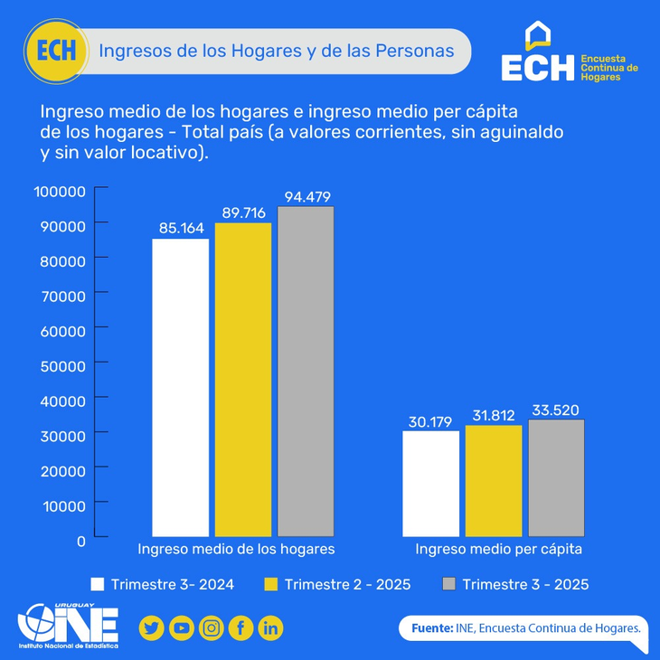 El ingreso medio de los hogares se ubicó en 94.479 pesos durante el tercer trimestre del año, lo que supone una notable mejora del 5,1% con respecto al período que va de abril a junio, según datos del Instituto Nacional de Estadística (INE).