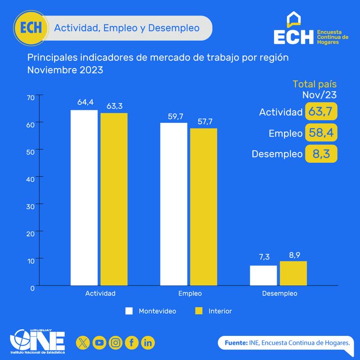 A su vez, en el interior la actividad fue menor, del 63,3% la cual obtuvo una baja de 0,2 puntos respecto al mes anterior, mientras que en la capital fue del 64,4%, 0,6 puntos menos que el del mes de octubre. En tanto, la comparativa por empleo, este fue del 57,7% en el interior, frente a un 59,7% en Montevideo.