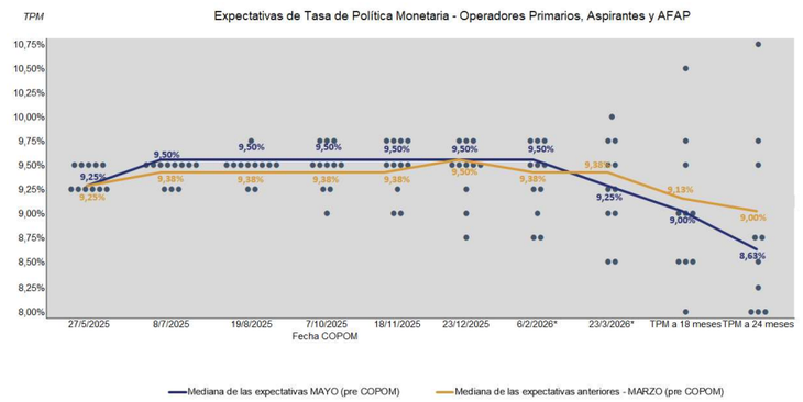Pensando en los próximos meses, aguardan una suba de 25 puntos básicos (p.b.) en la Tasa de Política Monetaria (TPM) en julio, momento en el cual se estacionaría en 9,50% por el resto del año.