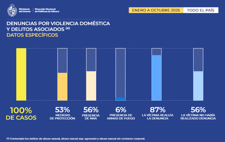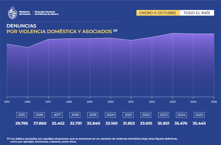 En el marco del Día Internacional de la Eliminación de la Violencia contra la Mujer, que se conmemora el 25 de este mes, la Dirección de Nacional de Políticas de Género del Ministerio del Interior publicó un informe con las cifras relacionadas a las situaciones de violencia doméstica y delitos asociados como amenazas, lesiones y otros —que se enmarcan en contextos violentos dentro de los hogares—, desde enero hasta octubre, inclusive. El documento, además, compara el mismo período en la última década.