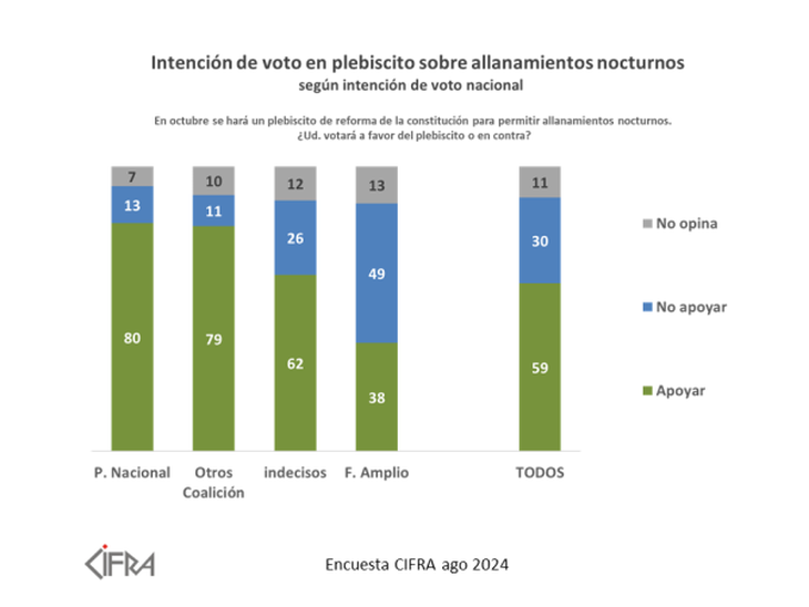 Y concluyeron: “El plebiscito sobre allanamientos nocturnos sí tiene el apoyo de más de la mitad del electorado, y hay varios líderes políticos que lo promueven. Podría alcanzar los votos necesarios, pero para ello es fundamental que los partidos y los militantes que están a favor transformen ese apoyo de palabra en papeletas ensobradas junto con el voto a presidente, una decisión que el votante de a pie considera mucho más trascendente y que hace que se olvide de la otra”.