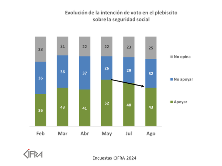El plebiscito que impulsa el PIT-CNT contra la reforma de la seguridad social continúa perdiendo apoyos y se aleja de la mayoría que necesita para ser validado en las urnas en octubre, según la última encuesta de Cifra.