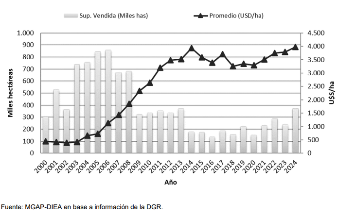 De acuerdo al último informe de la Oficina de Estadísticas Agropecuarias (DIEA) del MGAP, durante el año pasado se realizaron un total de 1.708 operaciones de compraventa, superando las 375.000 hectáreas vendidas, un 58% más que en el año 2023 por un total de 1.489.419 dólares.