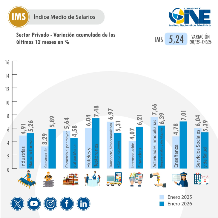 En términos nominales, el Índice Medio de Salarios Nominal (IMSN) aumentó 3,08% en enero y un 5,31% interanualmente, manteniéndose en niveles similares al IMS general. En términos reales, el Índice Medio de Salarios Real aumentó 2,28% en enero, producto de las variaciones del Sector Privado (1,79%) y del Sector Público (3,18%).
