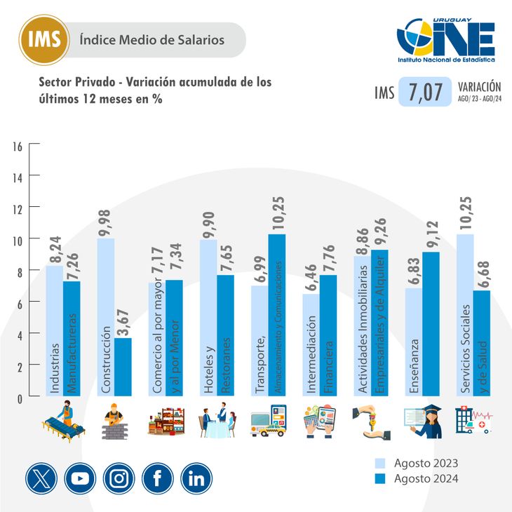 El Índice Medio de Salarios (IMS) aumentó un 0,09% entre julio y agosto, llevando el Índice General a 476,48 unidades y acumulando una variación anual del 6,06%. A nivel interanual, el crecimiento llegó hasta un 7,07%.