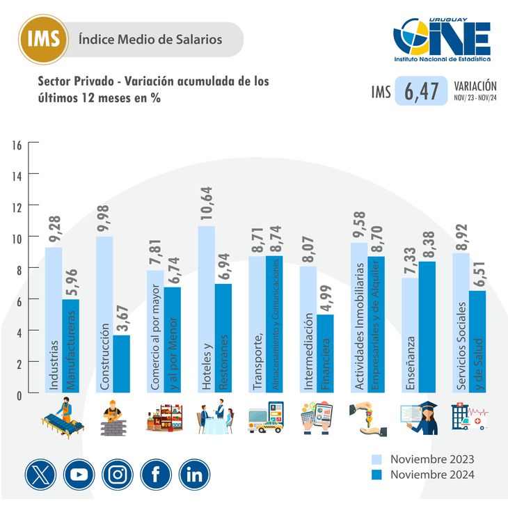 Por otro lado, el Índice Medio de Salarios Nominales (IMSN) avanzó un 0,01%, con una variación anual acumulada del 5,93% y una a nivel interanual del 6,21%.