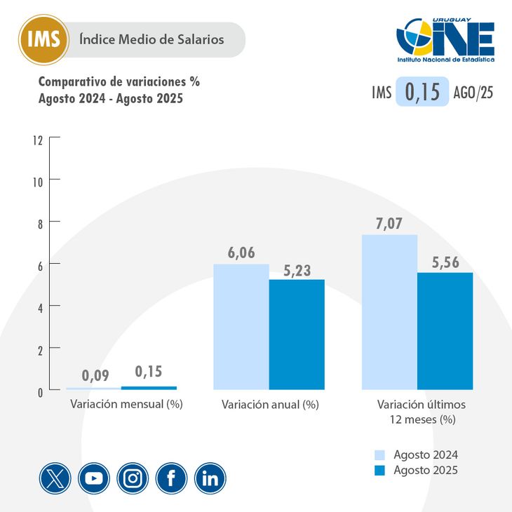 El Índice Medio de Salarios Nominal (IMSN), que sirve de referencia para la actualización de pasividades, registró en agosto una variación mensual de 0,18% y acumula un aumento de 5,12% en 2025.