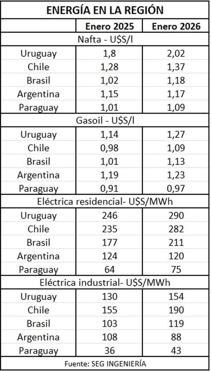 En el caso de la electricidad, Uruguay también tiene costos relativamente altos, pero el escenario es distinto. En la energía eléctrica residencial tiene el mayor precio, pero es muy similar al de Chile, mientras en Argentina y Brasil es prácticamente la mitad. El caso de Paraguay está “fuera de concurso”, porque al tener a las dos principales represas hidroeléctricas de la región, el costo de la electricidad es mucho menor que en el resto de los países.