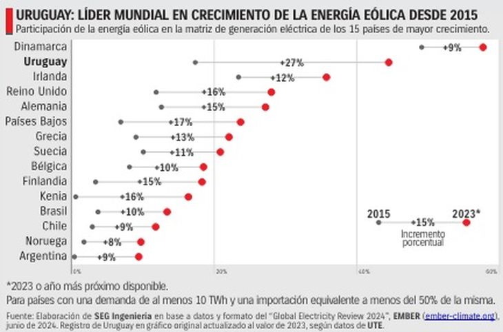 Uruguay fue destacado como el país con mayor crecimiento de la energía eólica en los últimos diez años, de acuerdo a un informe de la consultora SEG Ingeniería, basado en datos del en base a datos y formato del “Global Electricity Review 2024” de la plataforma Ember, especializada en transición energética.
