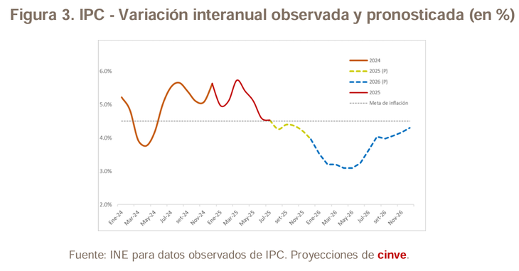 Para hacer dicha previsión, el Cinve puso en consideración la evolución del tipo de cambio como un factor determinante, ya que influye en la trayectoria estimada de los bienes y servicios transables que, a su vez, contribuyen en "la senda pronosticada de reducción de la inflación".
