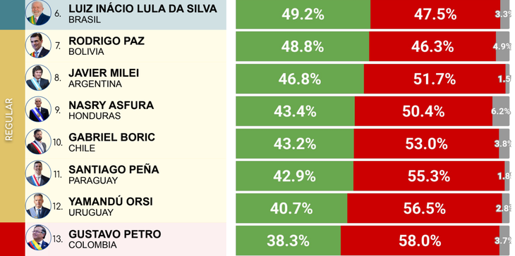 Entre los mandatarios de la región, detrás de Lula se ubicaron el boliviano Rodrigo Paz (48,8%) y el argentino Javier Milei (46,8%), en el séptimo y octavo lugar, respectivamente. En el décimo puesto aparece el presidente de Chile, Gabriel Boric (43,2%); y lo siguen inmediatamente el jefe de Estado de Paraguay, Santiago Peña (42,9%), y Orsi.