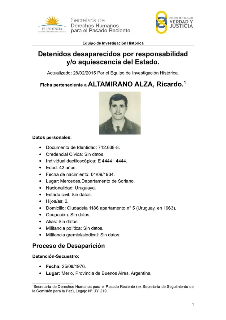 A casi 50 años de su desaparición, el Equipo Argentino de Antropología Forense (EAAF) confirmó que unos restos encontrados enterrados en un cementerio en 2009 pertenecían al uruguayo Ricardo Altamirano Alza, víctima de la última dictadura militar argentina.