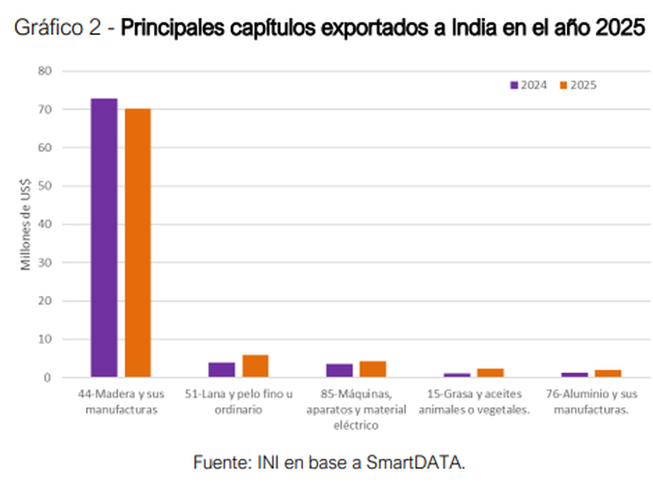 Según el relevamiento del INI-UCU, las exportaciones a suelo indio, sin contar zonas francas, totalizaron 88,9 millones de dólares, de las cuales el 79% correspondieron a la madera, con 70,2 millones y un retroceso del 3,2% interanual. Al ahondar en ese sector, se observa que la mayoría tuvo que ver con madera en bruto incluso descortezada, con tres empresas que concentraron tres cuartos del total: Idalen (41,5%), Latam Forest (19,2%) y TGL Uruguay (14,2%).