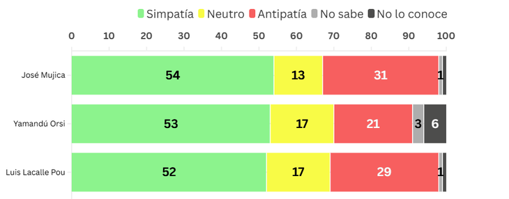 Al analizar por simpatías, Mujica lidera el ranking con un 54%, seguido por el exintendente de Canelones, con un 53%; y Lacalle Pou, con un 52%. Sin embargo, el exmandatario y máximo referente del MPP también lidera en las antipatías con un 31%, mientras que el actual presidente y líder del Partido Nacional (PN) alcanza un también elevado 29% en ese rubro.
