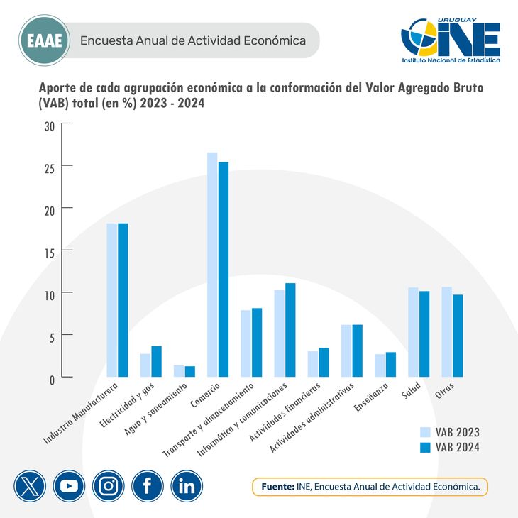 Por sectores, el comercio fue el principal aportante al valor agregado total, con el 25,4%, seguido por la industria (18,1%) y la información y comunicación (11,1%). En términos de variación interanual, se destacaron los aumentos en electricidad y gas con un crecimiento de 33,5%, y en las actividades de servicios financieros, que avanzaron 13,5%, mientras que agua y saneamiento registró una caída de 10%.