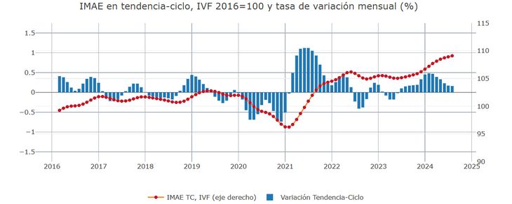 Del boletín técnico también se desprende que el IMAE registró una variación interanual del 3,4% frente al mismo período de 2023, y una del 0,2% en tendencia-ciclo en el mes de agosto.