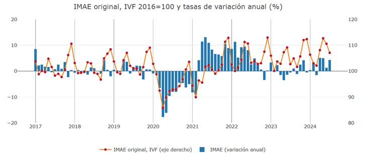 Del boletín técnico se desprende que el IMAE registró una variación interanual del 4,3% frente al mismo período de 2023, y una del 0,1% en tendencia-ciclo en el mes de julio.
