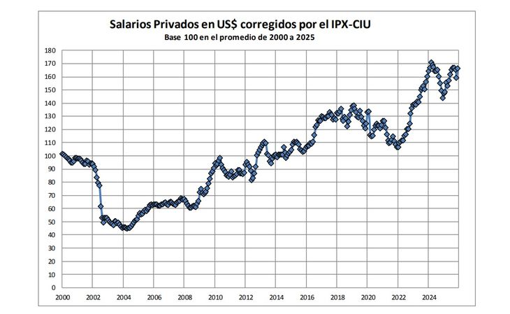 Los salarios privados medidos en dólares se ubican más del 60% por encima del promedio de lo que va del siglo.