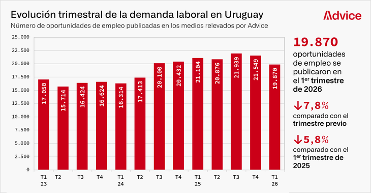La demanda laboral en Uruguay cayó un 5,8% interanual durante el primer trimestre del año, respecto del mismo período del 2025, y marcó así la primera caída tras dos años de expansión en el mercado laboral, lo que indica una nueva tendencia de contracción en un escenario de bajo crecimiento económico proyectado.