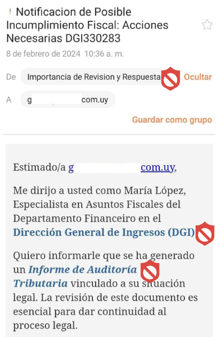 Frente a esto, desde la DGI recomendaron "verificar señales de alerta de mensajes engañosos, comprobando la dirección del remitente, y evitar seleccionar enlaces y brindar información personal o confidencial, entre otras medidas preventivas que se pueden realizar".