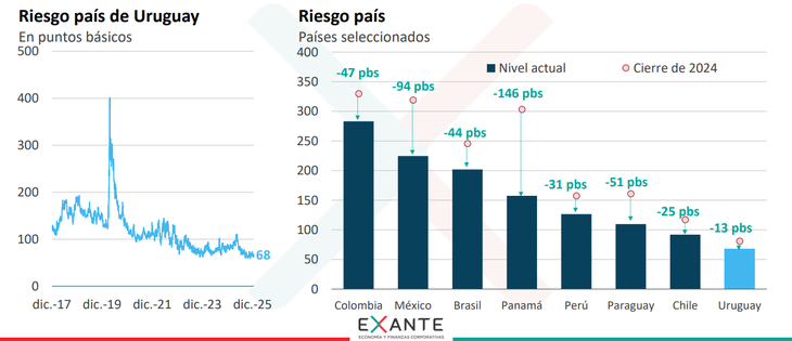 Pese al deterioro fiscal y al aflojamiento de expectativas, el riesgo país está en mínimos históricos de 68 puntos básicos, lo que ubica a Uruguay como uno de los países más confiables de América Latina para inversores internacionales. La compresión de la prima de riesgo en Uruguay fue menor que en otros países de la región como México (caída de 94 pbs), Panamá (146 pbs) o Brasil (44 pbs), pero partía de niveles ya bajos que reflejan la solidez institucional y la credibilidad de la política económica uruguaya.