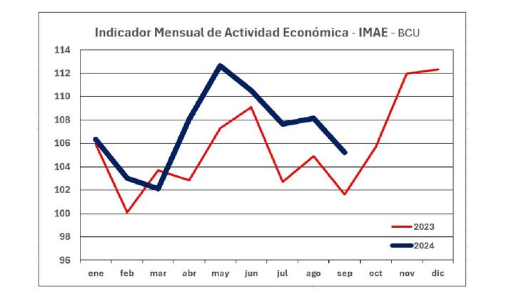 La economía uruguaya está mostrando mejoras en varios indicadores en los últimos meses, después de un arranque del año débil y con poco avance respecto al año anterior. El Indicador Mensual de Actividad Económica (IMAE), que elabora el BCU, no tuvo mayores avances en los primeros meses del año, en comparación con el año anterior. Pero ya a mediados de este 2024 comenzó a mejorar y ha mantenido una dinámica positiva, con el último dato -correspondiente a septiembre- ubicándose 3,6% por encima de lo registrado en el mismo mes del año pasado (gráfica).