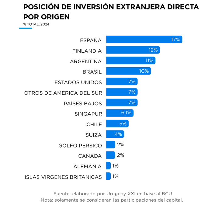 Por otra parte, y con el foco puesto en la posición de inversión extranjera directa por origen, España mantuvo el primer lugar, representando un 17% del total de IED que llegó al país en 2025. El dato no es menor: el segundo lugar es ocupado por Finlandia, que se mantiene bastante por detrás con un 12% y se explica, en su mayoría, por las operaciones de las dos plantas de UPM que operan en el territorio uruguayo.