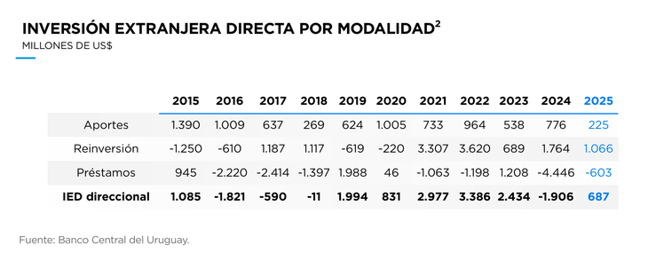 Uruguay regresó en 2025 a la senda positiva en términos de inversión extranjera directa (IED) luego de un año de retroceso y totalizó 687 millones de dólares, con España consolidándose como el principal origen de estos fondos.