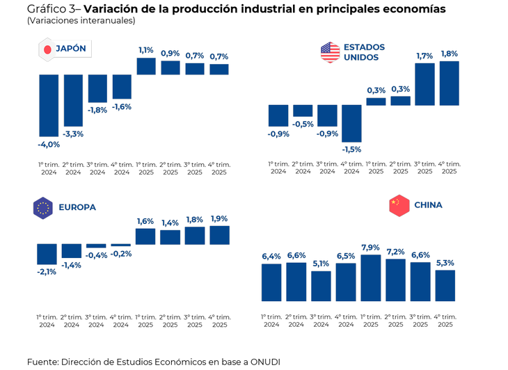Por otra parte, el Monitoreo Industrial de la CIU también relevó las variaciones de la producción industrial en las principales economías globales que, en general han “demostrado una resiliencia significativa y un crecimiento sostenido durante el segundo semestre de 2025, extendiendo una racha ininterrumpida de expansión trimestral que comenzó a mediados de 2022”.