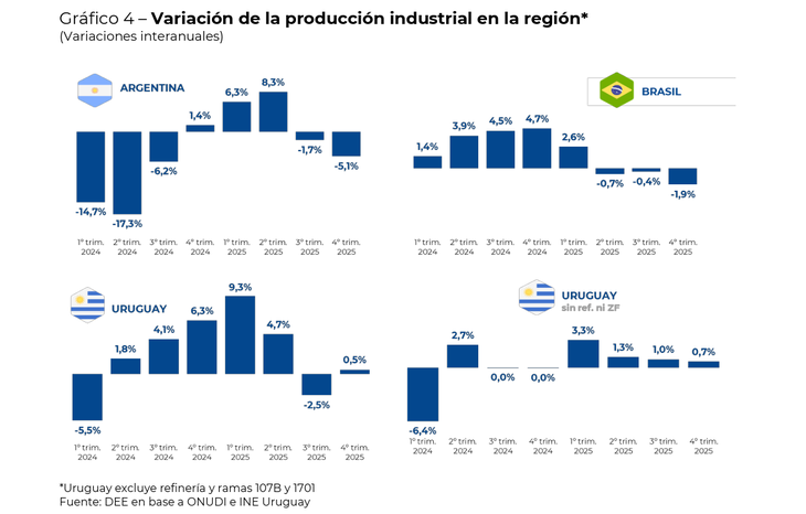 El resultado positivo se observó también en las mediciones de la Cámara de Industrias del Uruguay (CIU), que registró un aumento interanual del 0,7% en el cuarto trimestre para el núcleo industrial —que no incluye la celulosa y los concentrados de bebidas de las zonas francas—, y del 0,8% en la producción manufacturera, excluyendo la refinería de Ancap. Sin embargo, este comportamiento positivo no fue el general a nivel regional.