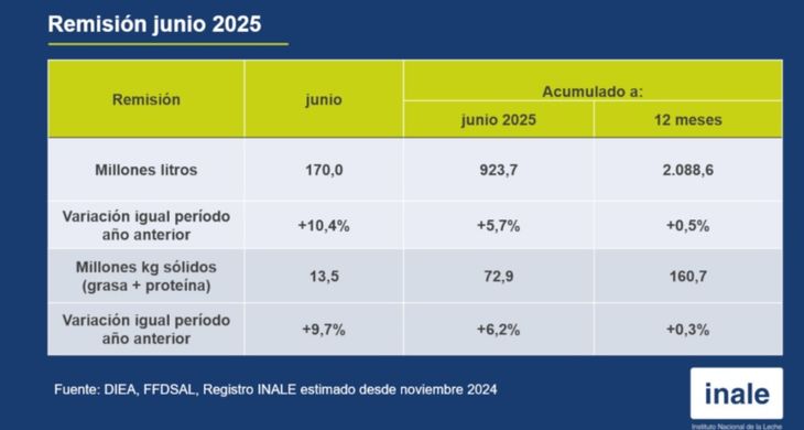 Durante junio, la remisión de leche llegó a un total de 170 millones de litros, mientras que en los últimos seis meses fue de 923 millones mientras que el acumulado de doce meses llegó a los 2.088 millones de litros. Por su parte, los sólidos también obtuvieron aumentos del 9,7% interanual en junio (con 13,5 millones de kilos de proteína y grasa), una suba del 6,2% también se percibió durante los últimos seis meses.