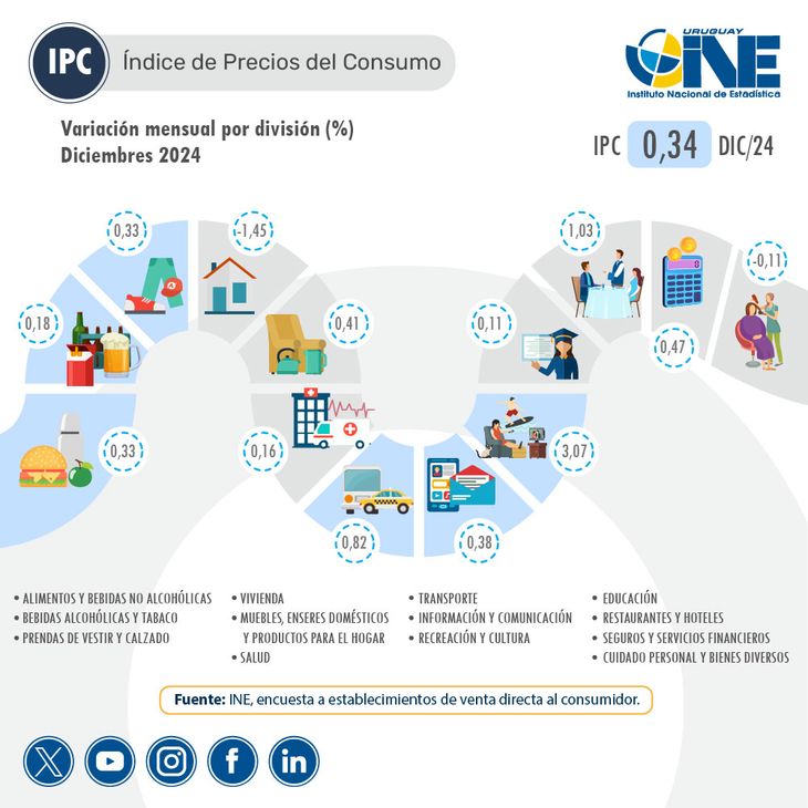 A su vez, se evidenció un incremento del 0,82% de la división transporte, impulsado por la variación del dólar, mientras que hubo un retroceso del 1,45% en vivienda, agua, electricidad, gas y otros combustibles, vinculado a la aplicación del programa “UTE Premia” en las facturas de energía eléctrica.