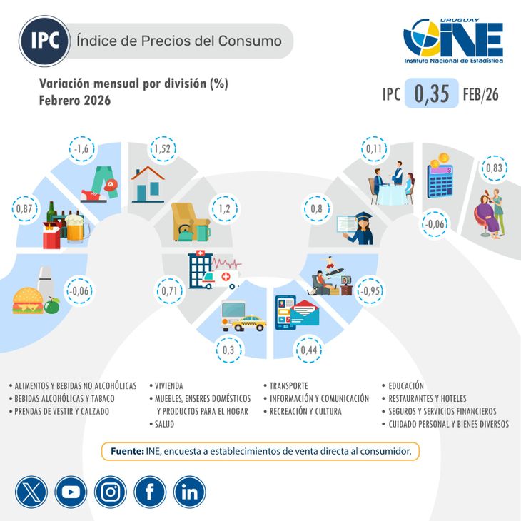 El Índice de Precios del Consumo (IPC) que elabora el Instituto Nacional de Estadística (INE) tuvo una variación mensual del 0,35% en febrero, y acumula un 1,27% en lo que va del año. Los analistas esperaban una suba del 0,62% en el mes, una proyección todavía más moderada que la apuntaron para enero (1,09%), tradicionalmente un mes en el que impactan la medición los ajustes tarifarios. Finalmente, el indicador registró una suba menor a la proyectada, que vuelve a encender alarmas en el equipo económico.
