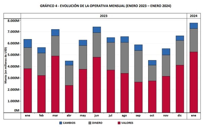 Finalmente, el mercado de cambios representó 487,5 millones, un incremento de 20,9% respecto a los 403,2 de diciembre y una baja de 32,1% con relación a los 717,7 millones de enero de 2023.