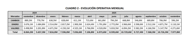 El mercado de valores también cedió terreno y movió 4.271,6 millones de dólares, una caída de 17% respecto a octubre. Aunque en la comparación anual sube 22%, el contraste mensual muestra un freno claro, sobre todo en el segmento primario, que se achicó más de 21%.