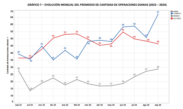 Vale destacar que la operativa diaria promedio fue de 142 transacciones en setiembre, la cifra más alta de los últimos 13 meses, impulsada por las 67 operaciones promedio diarias del mercado de cambios, el punto más alto en la misma serie.